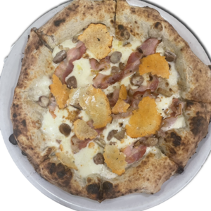 Base Fior di Latte, Pancetta croccante, Castagne arrostite, Scaglie di Parmigiano, Filo di riduzione di Aceto Balsamico.