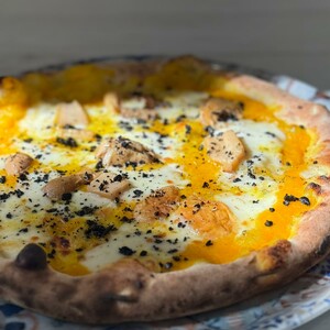 Impasto alla zucca, crema di zucca, mozzarella, olive nere disidratate e porcini.