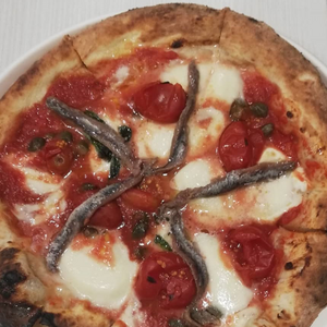Scarola (invidia), Fior di Latte, Olive nere di Gaeta, Acciughe di Cetara (in uscita), Olio evo.